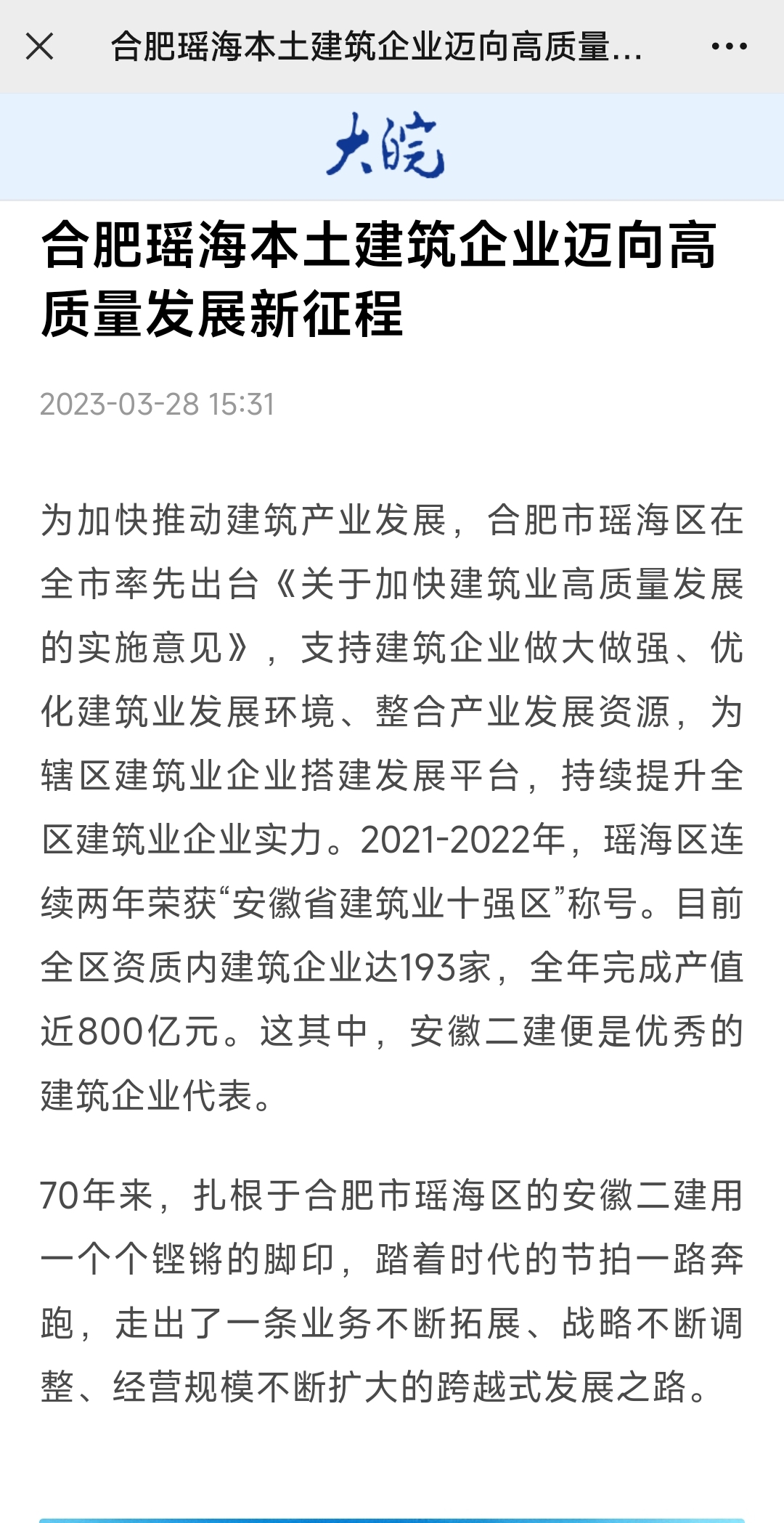 3月28日,人民網安徽頻道、中國網韻動安徽、中國日報網、安徽日報、大皖新聞、瑤海發布等權威主流媒體相繼報道安徽二建公司建企70周年發展成就,滿懷信心邁向高質量發展新征程。