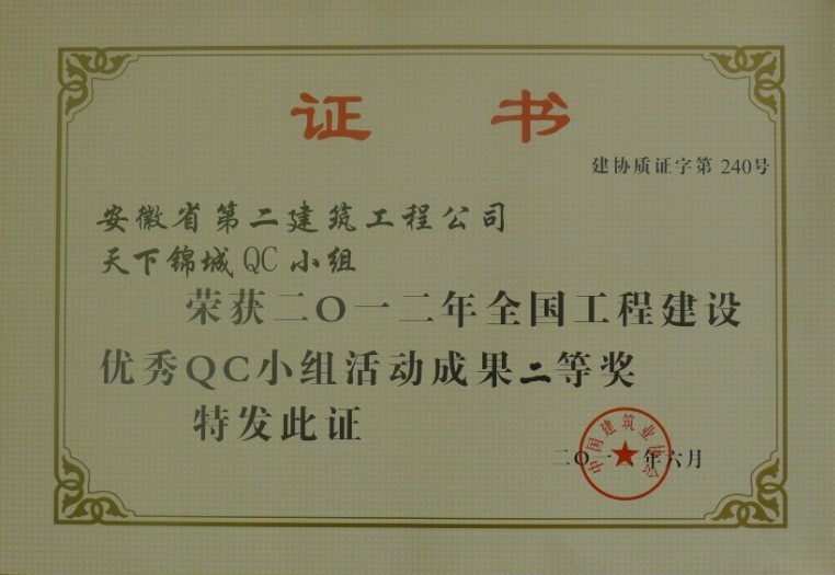 安徽二建公司喜獲“2012年度全國工程建設優秀QC小組活動成果”二等獎和省級一等獎
