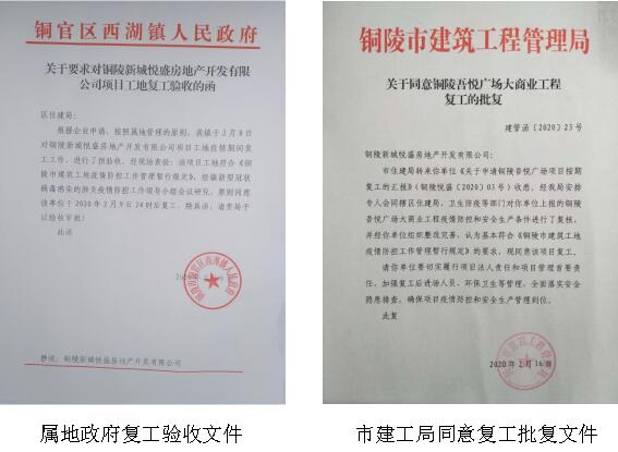 2月12日,銅陵市住建局安排專人會同銅官區(qū)住建、衛(wèi)生防疫等部門,對項目部疫情防控及安全生產(chǎn)條件進行復核,認為基本符合《銅陵市建筑工地疫情防控工作管理暫行規(guī)定》的要求。2月17日,銅陵市住建局下發(fā)《關于同意銅陵吾悅廣場大商業(yè)工程復工的批復》,同時提出要加強復工后進場人員環(huán)保衛(wèi)生管理,全面落實安全隱患排查,確保項目疫情防控和安全生產(chǎn)管理到位。