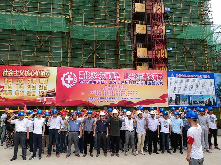 “我是一名安徽建工人,我鄭重宣誓:時刻注意安全,遵守安全法規(guī)。履行安全職責,提高安全技能。杜絕三違現(xiàn)象,保證四不傷害。強化紅線意識,促進安全發(fā)展……”。嘹亮的宣誓聲響徹整個施工現(xiàn)場,震撼人心。6月1日早晨7:00,在宿松安建·龍溪山莊工程施工現(xiàn)場,由業(yè)主、監(jiān)理及安建·龍溪山莊項目部員工近百人組成的宣誓隊伍莊嚴宣誓,并簽字承諾,借此拉開“安全生產(chǎn)月”活動序幕。